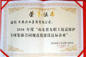 2018年12月,山東省總工會授予日照興業(yè)集團“2018年度山東省女職工權(quán)益保護專項集體合同規(guī)范化建設達標企業(yè)”